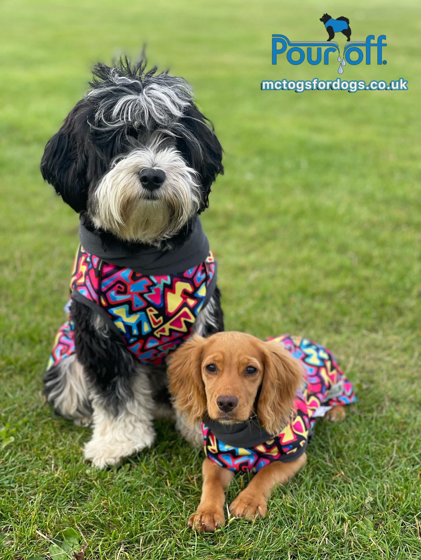2) Waterproof Pour Off® Single layer McTogs - These are our patterned fabrics - they have the appearance of a soft shell. The outer is a sleek patterned waterproof, breathable fabric, the inside is microfleece, which lies against your dog. Due to the waterproof quality this style has 2 way stretch - so less than Polar Fleece.